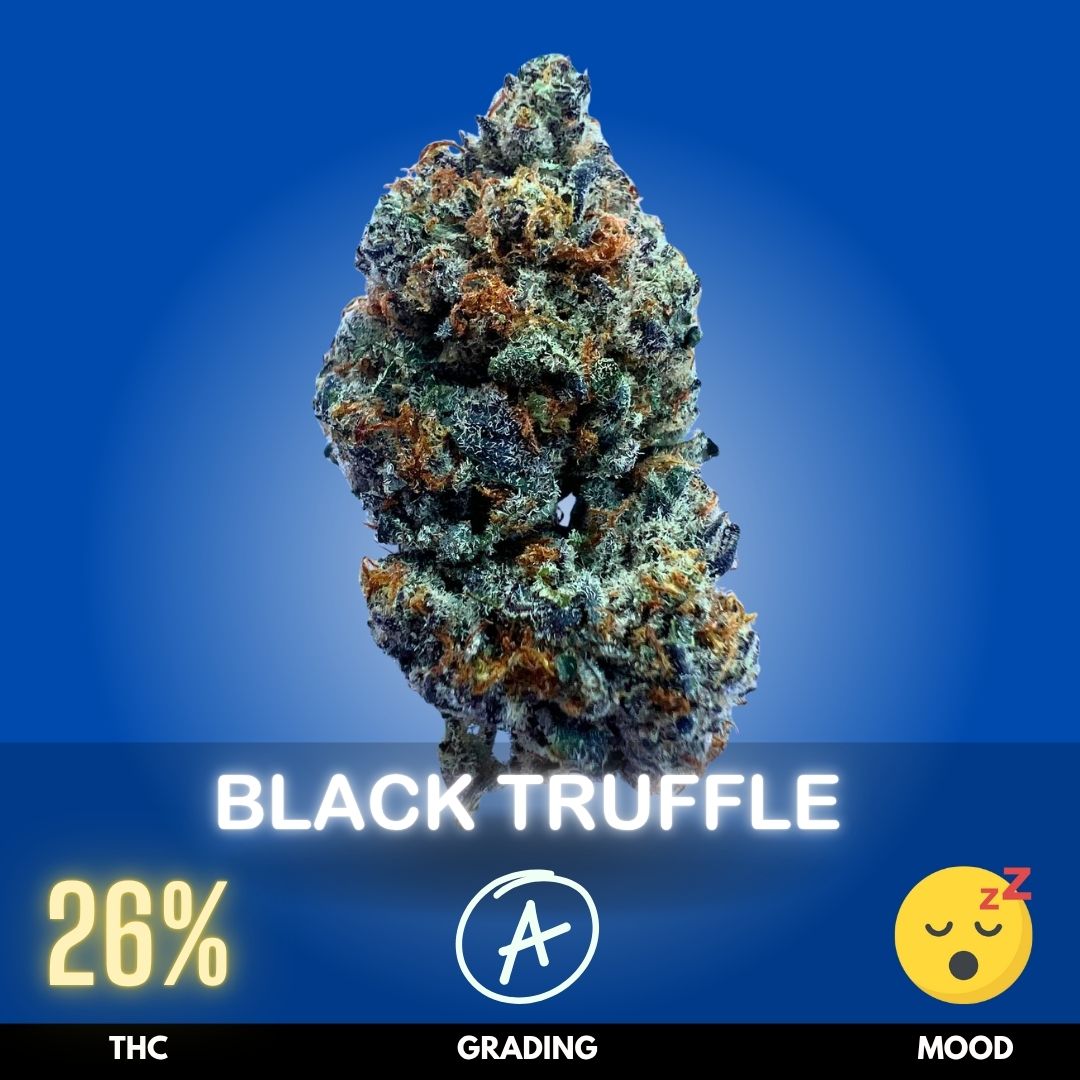 Black Truffle carries a THC range around 26‑31%, depending on phenotype and grow. It is an Indica‑dominant hybrid, typically in the ~60% Indica / ~40% Sativa range.