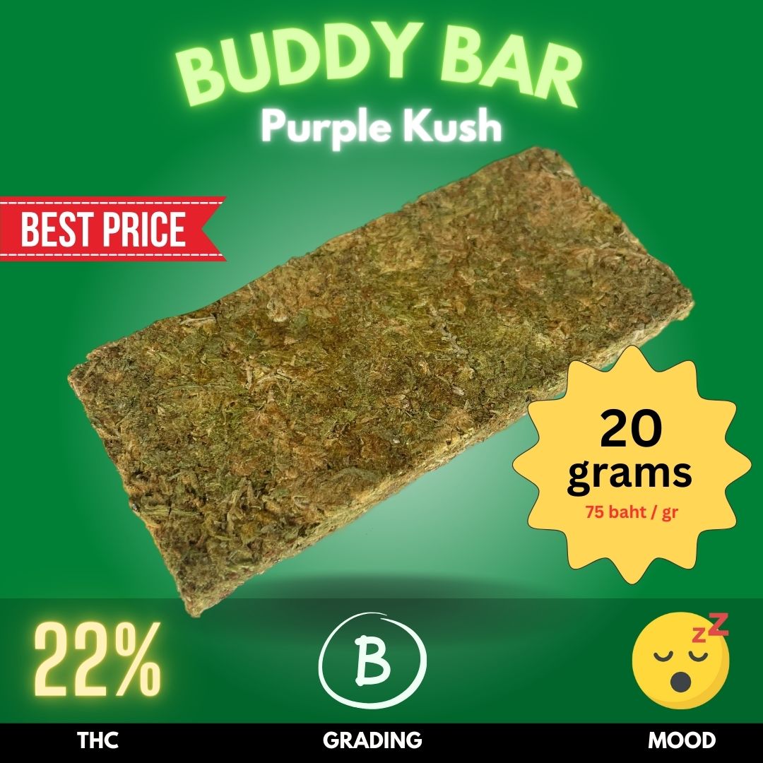 Introducing the latest addition to our Buddy Bar collection, crafted with the legendary Purple Kush strain. This exquisite cannabis bar is made from the finest, meticulously selected buds of Purple Kush, known for its deeply relaxing Indica effects and a potent THC concentration of approximately 22%. These seedless, premium buds are transformed into our Buddy Bars using a sophisticated heat compression method, ensuring the absence of any synthetic adhesives or chemicals, resulting in a product that’s as pure as it gets.