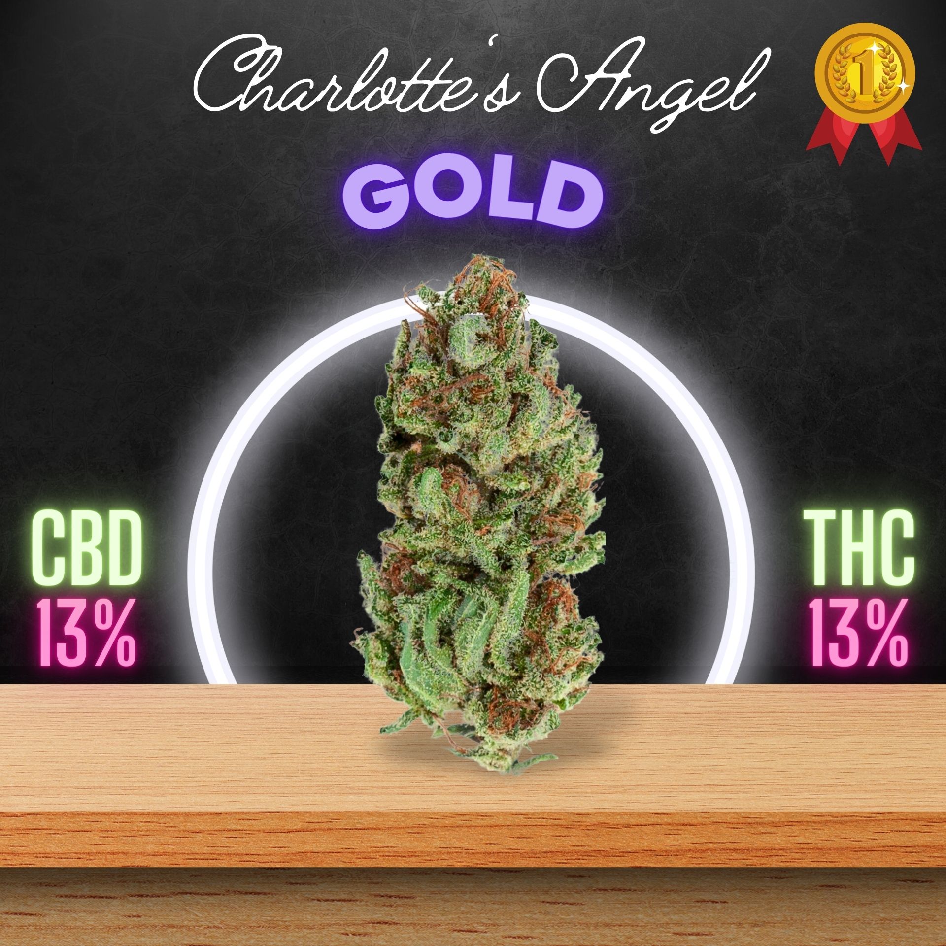 Charlotte’s Angel Gold is a variant of the classic Charlotte’s Angel, but with a kick thanks to a much higher THC-level compared to the original. Charlotte’s Angel Gold is a Sativa dominant CBD-rich flower with 13% CBD and 13% THC. This combination allows Charlotte’s Angel Gold to give you a nice relaxed state of mind while enjoying the medicinal properties from the extraordinary high CBD-levels. This greenhouse-grown organic lady smells and tastes like a herbal treat with pine and diesel undertones. As to it’s effects, Charlotte’s Angel Gold offers a calming experience from head to toe.