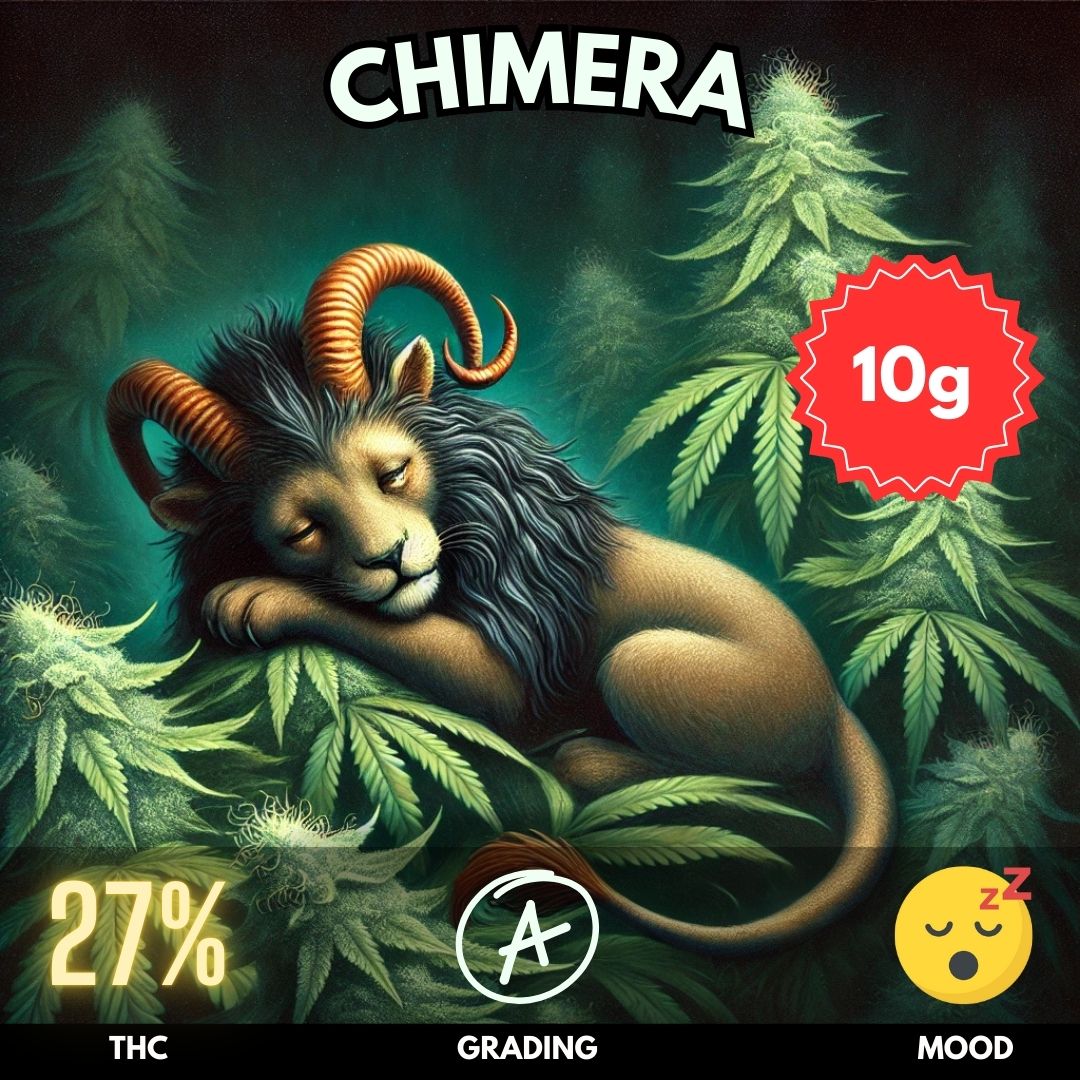 Chimera is a powerfully potent hybrid strain, revered for its complex effects and striking appearance. With a perfectly balanced genetic profile and a staggering THC content of 27%, this strain is not for the faint of heart. Chimera’s dense, resin-drenched buds showcase deep emerald tones with hints of violet, wrapped in a thick frosting of trichomes that hint at the intensity within.