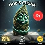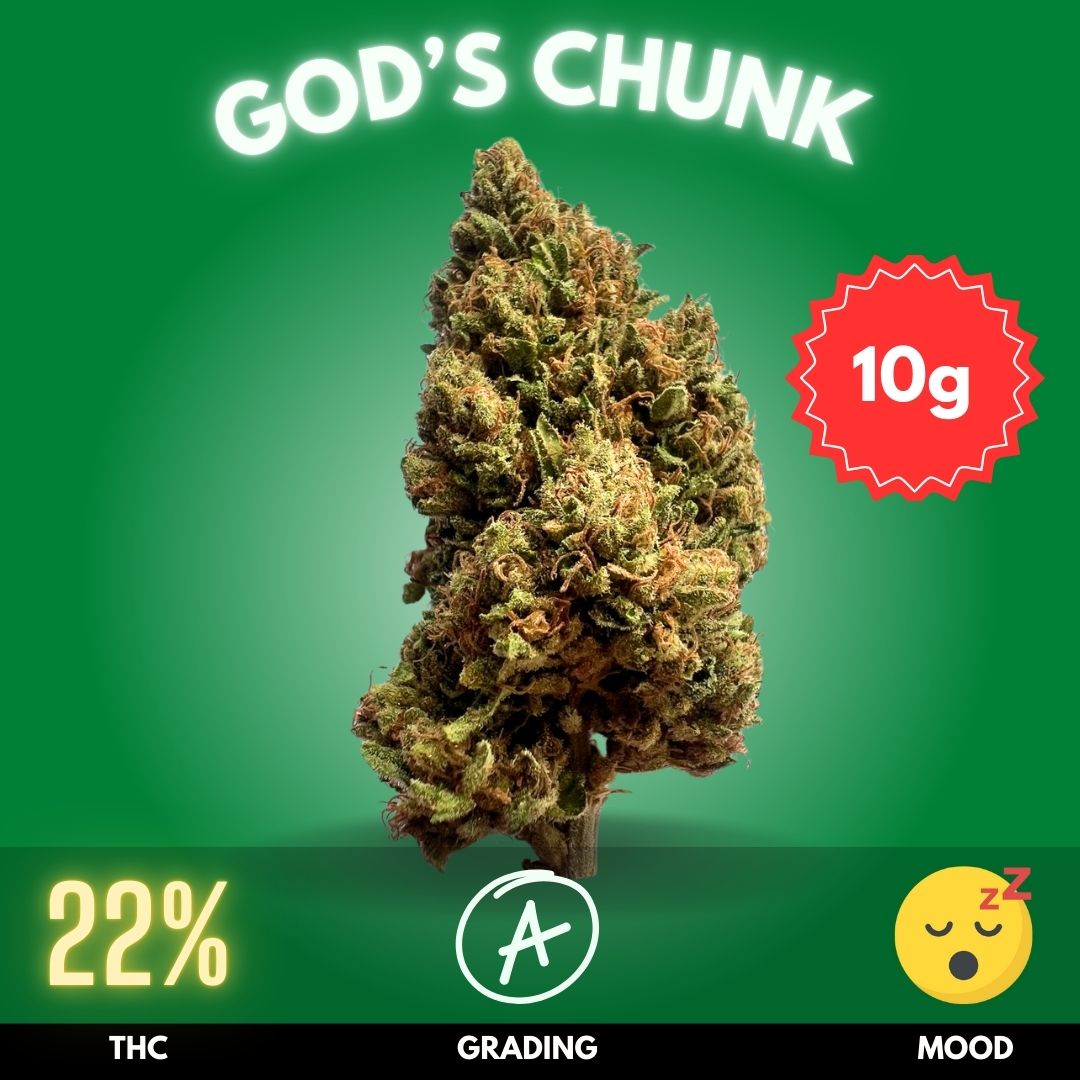 God’s Chunk is a powerfully relaxing Indica-dominant hybrid, renowned for its deeply soothing effects and earthy, sweet aroma. With a THC content typically hovering around 22–24%, this strain delivers a heavy body high complemented by subtle cerebral uplift, making it ideal for evening use. The buds are dense and resinous, often showcasing hints of purple under their rich forest green exterior.