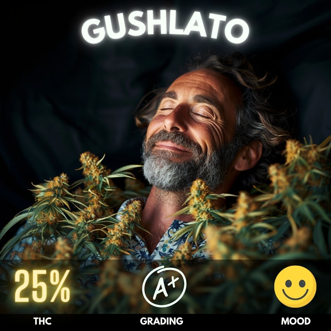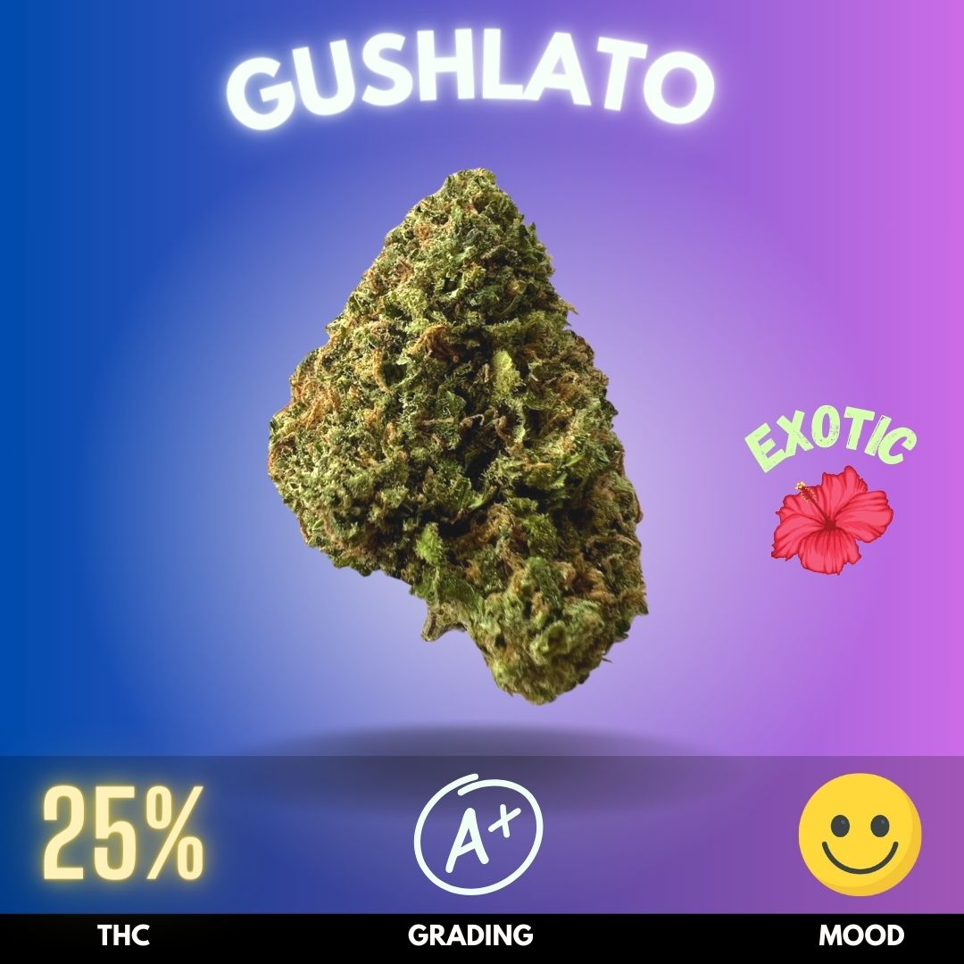 - Gushlato’s visual appeal is as striking as its effects, boasting dense, frosty buds that are a testament to its premium genetics.