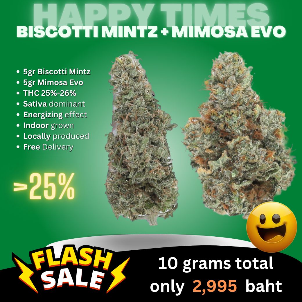 Our Happy Times-deal is guaranteed to put a smile on your face. Save almost 2,000 baht on two of our absolute favorites, Biscotti Mints and Mimosa Evo. Both are indoor-grown and extremely powerful when you need a happy and uplifting experience.