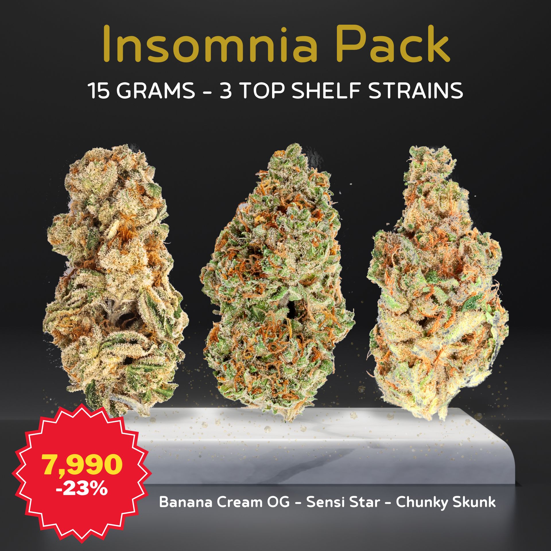 Our Insomnia Pack is the perfect solution when you want to wind down or need help with insomnia. It comes with 3 top shelf strains at 5 grams each (a total of 15 grams).