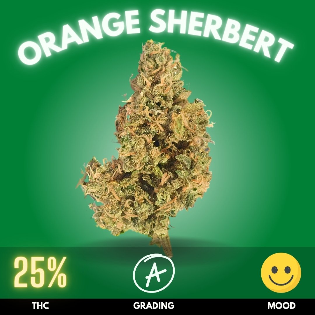 Orange Sherbert, a premium cannabis strain, delivers a vibrant symphony of citrusy freshness combined with a potent THC level of around 25%. Bred from a powerful trio of Orange Cream, Purple Urkle, and Cherry Pie, this hybrid marvel stands out with its rich orange aroma and hues, reminiscent of a summer’s sunset.