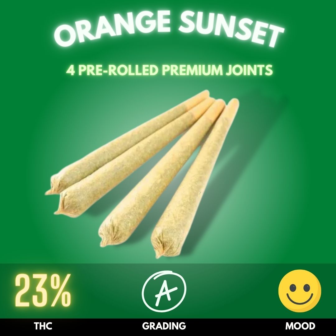 Step into a world of citrus bliss with our Orange Sunset pre-rolled joint 4-pack, a vibrant blend of Blue Sunset Sherbert, Blue Cinderella 99, and Orange Sherbert. This concoction yields a sativa-dominant hybrid, perfect for those who crave an energetic and uplifting experience. With THC levels typically hovering around 20-25%, Orange Sunset offers a potent journey, ideal for sativa lovers and those seeking a powerful cerebral high.