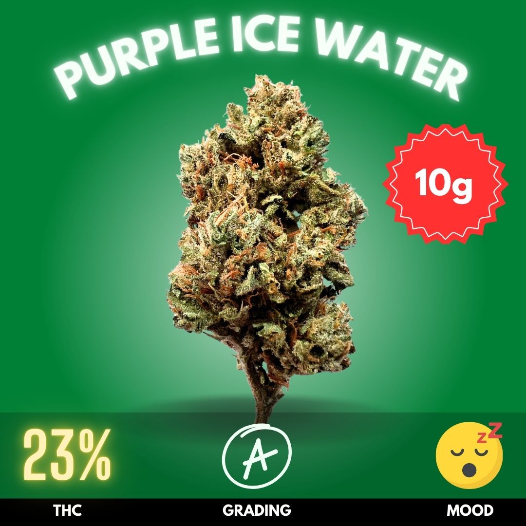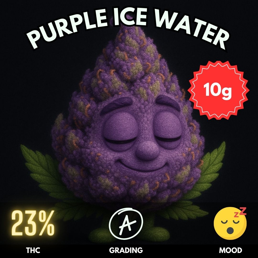 The Purple Ice Water cannabis strain is a rare hybrid recognized for its vibrant purple hues, calming effects, and complex flavor profile. It is an Indica-dominant cultivar, typically composed of approximately 70% Indica and 30% Sativa genetics. THC content averages around 23%, delivering a potent but smooth high suitable for experienced users. Visually, it features dense, frosty buds with streaks of violet and a coating of trichomes, making it both visually appealing and highly resinous.