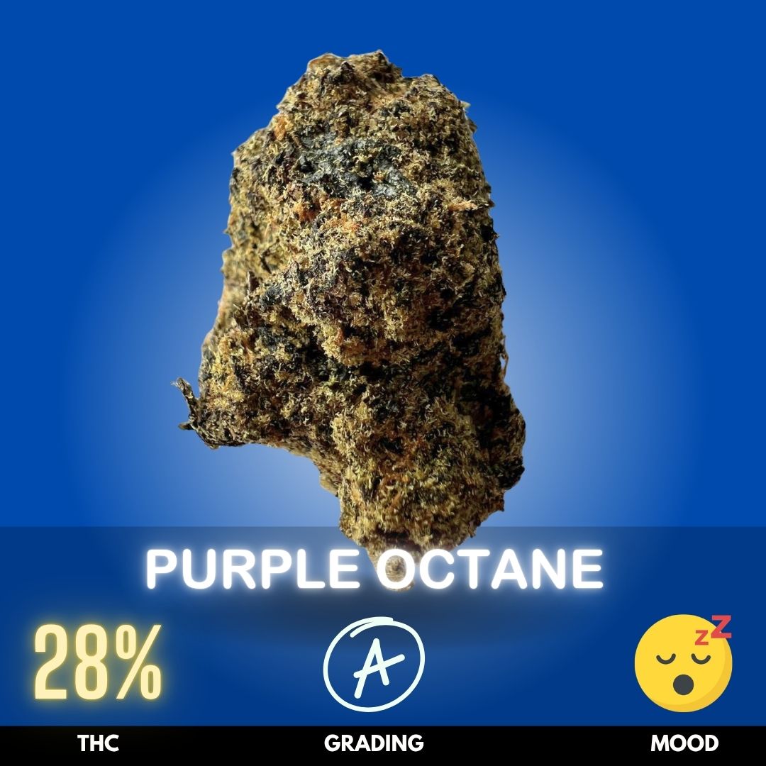 Purple Octane is a powerful Indica-dominant hybrid strain known for its heavy potency and fuel-forward terpene profile. With THC levels around 28%, it delivers a strong, long-lasting experience suited for seasoned users. This strain is commonly bred from Biscotti and Sherb BX (Sherbet backcross), combining dessert-like sweetness with deep gassy undertones. Its aroma features rich notes of diesel, sweet berries, and creamy spice, wrapped in a pungent earthy finish.