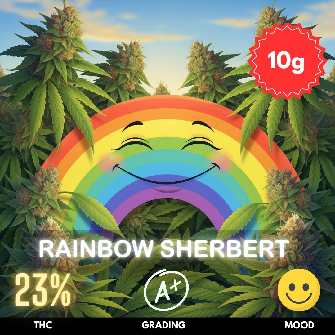 Rainbow Sherbert is a Sativa-dominant strain known for its colorful character and euphoric effects. With 23% THC and expertly indoor grown, it produces dense, resinous buds bursting with purple hues and citrus-sweet aromas. The flavor is a bold mix of berries, tropical fruit, and creamy undertones, reminiscent of its dessert-inspired name. The high begins with an uplifting cerebral buzz that boosts mood and focus, making it perfect for daytime creativity or social vibes.
