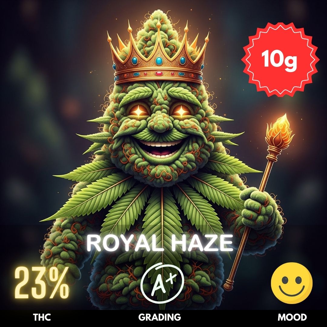 Royal Haze is a Sativa-dominant cannabis strain delivering an energetic and uplifting experience. With a THC content of 23%, it’s a potent choice for users seeking mental clarity, creativity, and motivation. Cultivated indoors to perfection, this strain boasts dense, frosty buds with vibrant orange hairs and a citrusy, herbal aroma layered with notes of incense and spice. The high sets in quickly, clearing the mind and invigorating the senses without the heaviness of Indica effects.