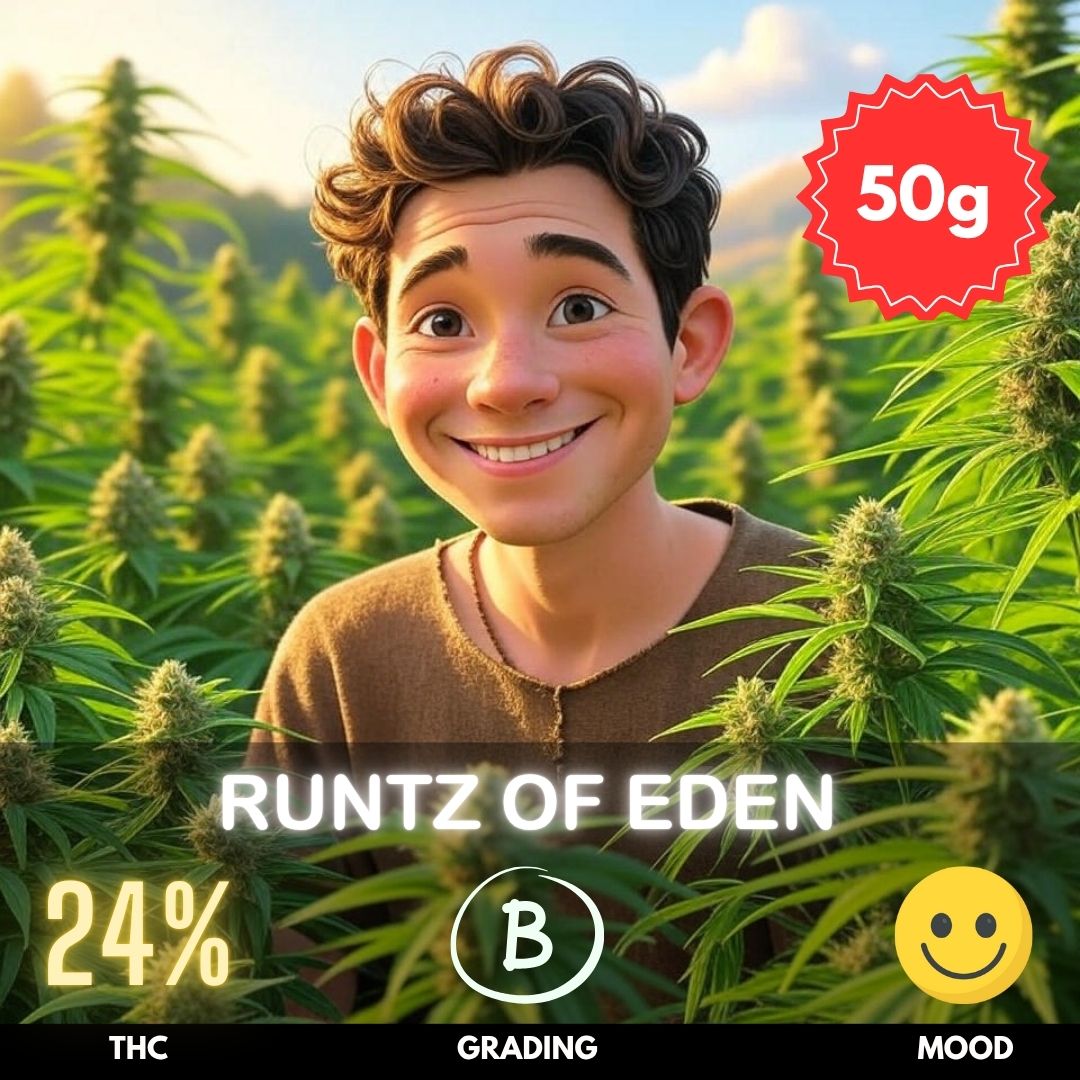 Runtz of Eden is a captivating balanced hybrid strain with a potent THC content of 24%. This strain masterfully merges the best traits of its parent strains—Runtz and Forbidden Fruit—offering a euphoric yet grounded experience ideal for both recreational and therapeutic users. The aroma combines fruity sweetness with earthy undertones, complemented by hints of tropical citrus and subtle herbal notes. Visually, the buds are dense and colorful, exhibiting a spectrum of green, purple, and orange pistils under a blanket of frosty trichomes.
