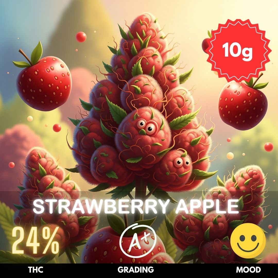 Strawberry Apple is a tantalizing hybrid strain that leans slightly Sativa-dominant, offering a well-balanced blend of cerebral stimulation and physical relaxation. With a THC content of 24%, it delivers a potent yet approachable experience. The genetics are thought to stem from a cross between Strawberry Cough and Sour Apple, resulting in a fruit-forward profile that bursts with ripe berry and tart green apple notes.