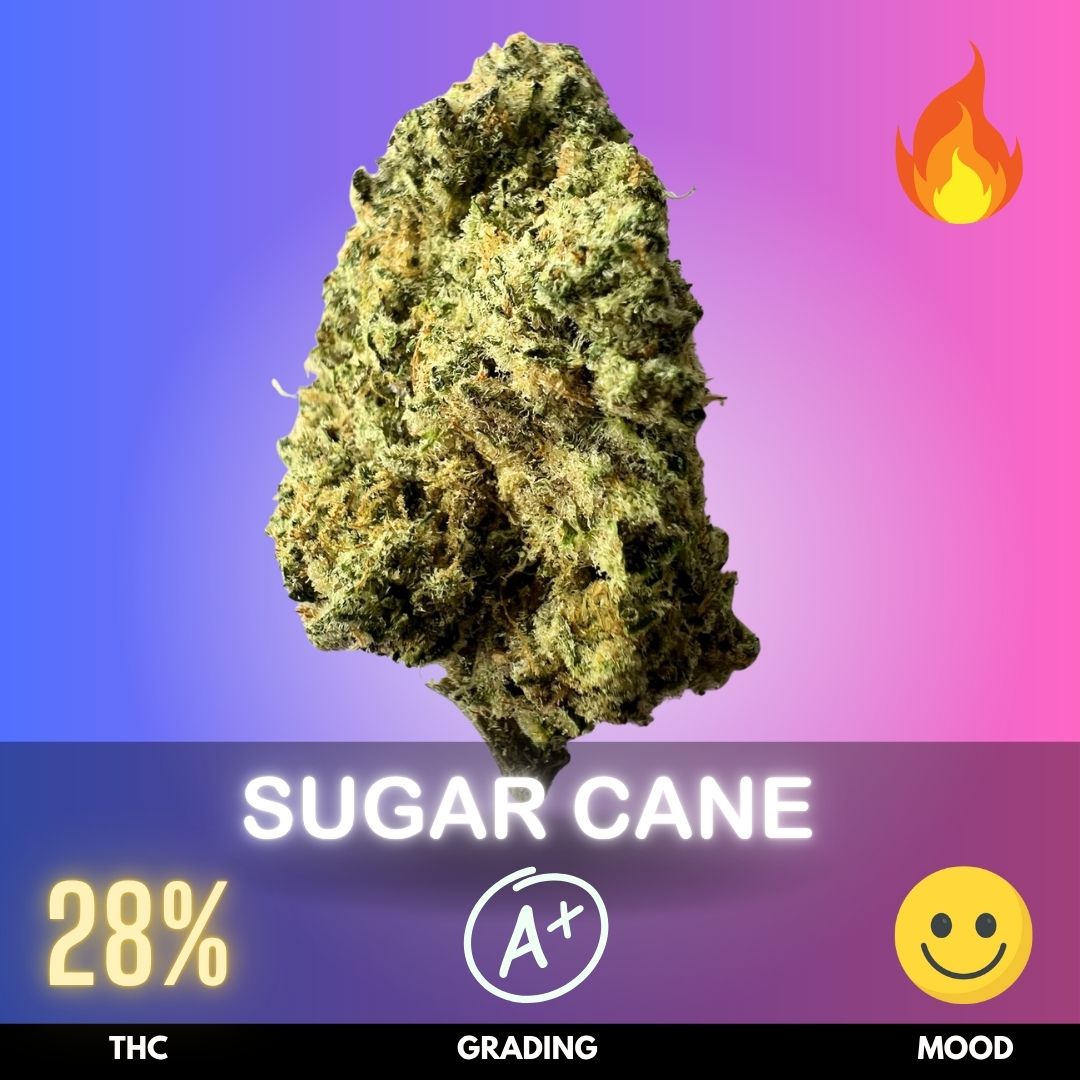 Sugar Cane is a Sativa-dominant hybrid (60% Sativa, 40% Indica) born from the flavorful crossing of Platinum x Slurricane. This strain is known for its sparkling trichome-coated buds and its strikingly sweet, candy-like aroma that blends notes of tropical fruit and honey with subtle earthy undertones. With THC levels averaging between 26–28%, Sugar Cane delivers a fast-hitting cerebral uplift that melts into a long-lasting body relaxation—an experience both euphoric and soothing.